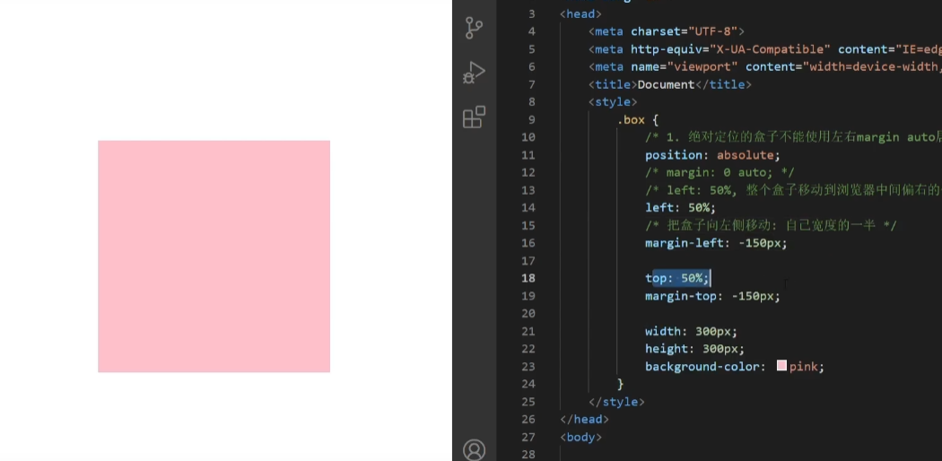那么如何居中呢,使用定位的left,right等(注意如left:50%,会让盒子的最左边在父级中心线上,而不是一个正方形盒子正好居中,对半分),因为这个原因,所以还需要与margin配合居中。